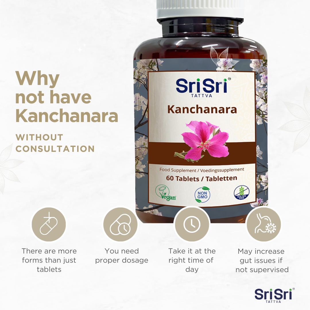 Sri Sri Tattva manufactures Kanchanara tablets with high-quality Kanchanara powder, which is binded together as a herbal tablet easy for consumption.