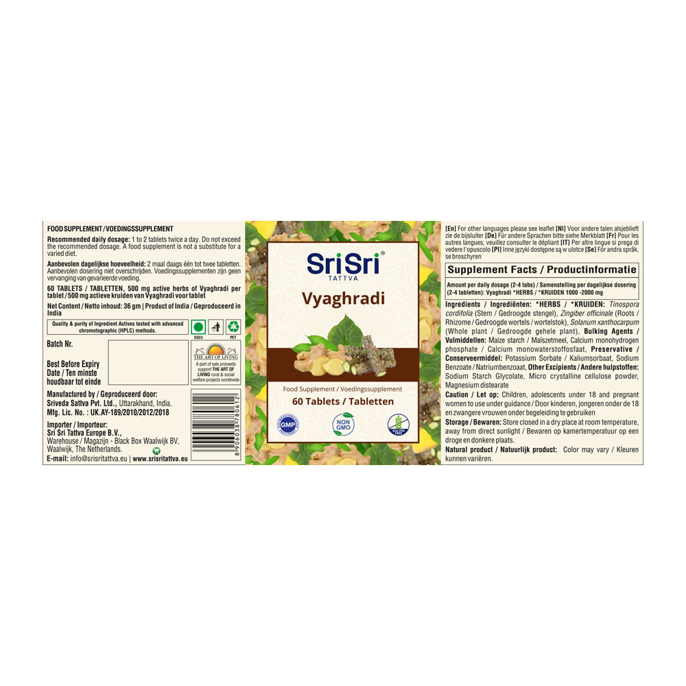 Vyaghradi is composed of Guduchi and is one of the most used plants in Ayurveda: it is appreciated for its Doshatrayara function, which allows it to act on balancing the three doshas. Sri Sri Tattva is one of the leading brands in Ayurveda and each of our products including Vyaghradi has been prepared using best Ayurvedic practices.