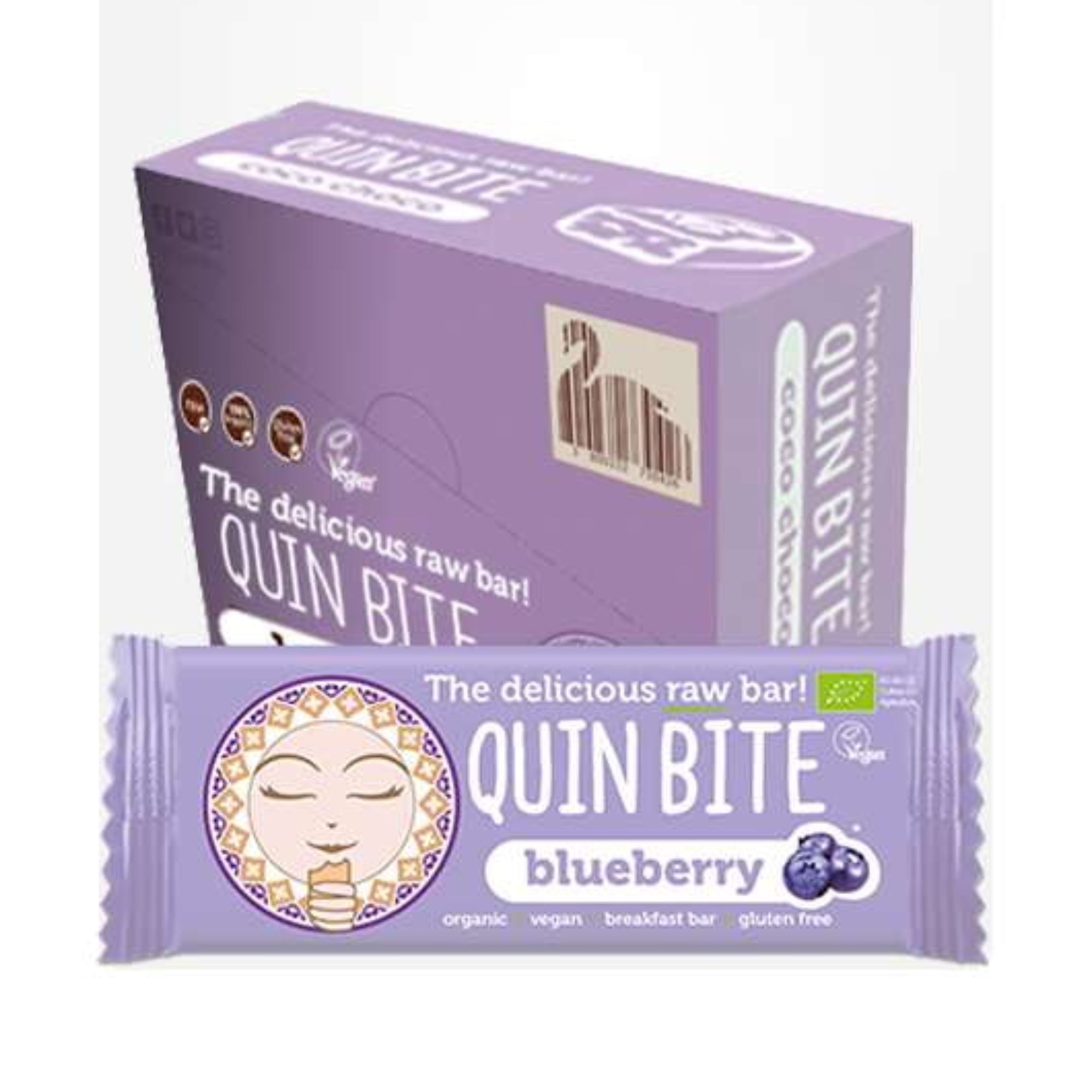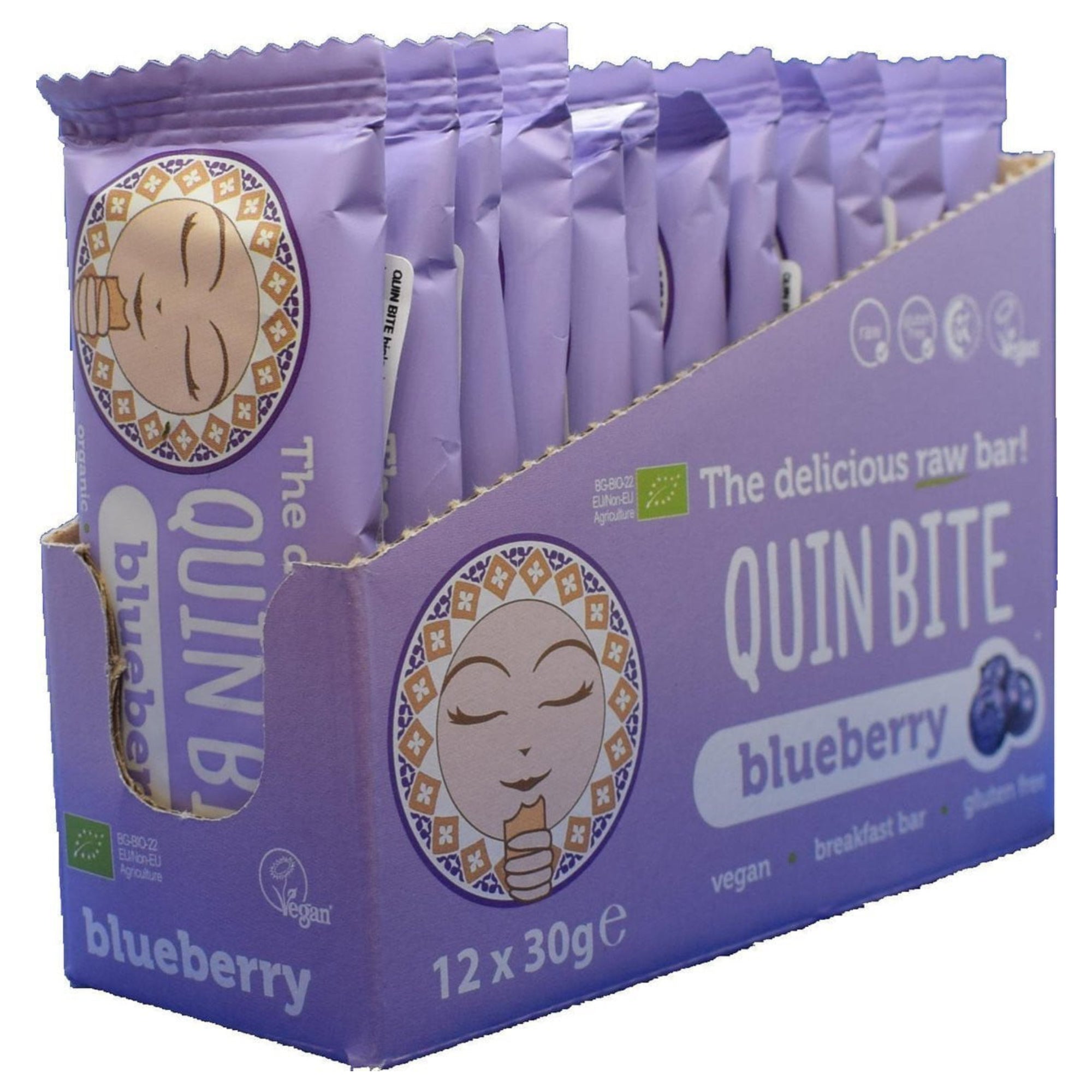 Enkel stuk / 12 stuks per doos: Quin Bite Blueberry wordt geleverd in een doos met 12 individuele rauwe repen.