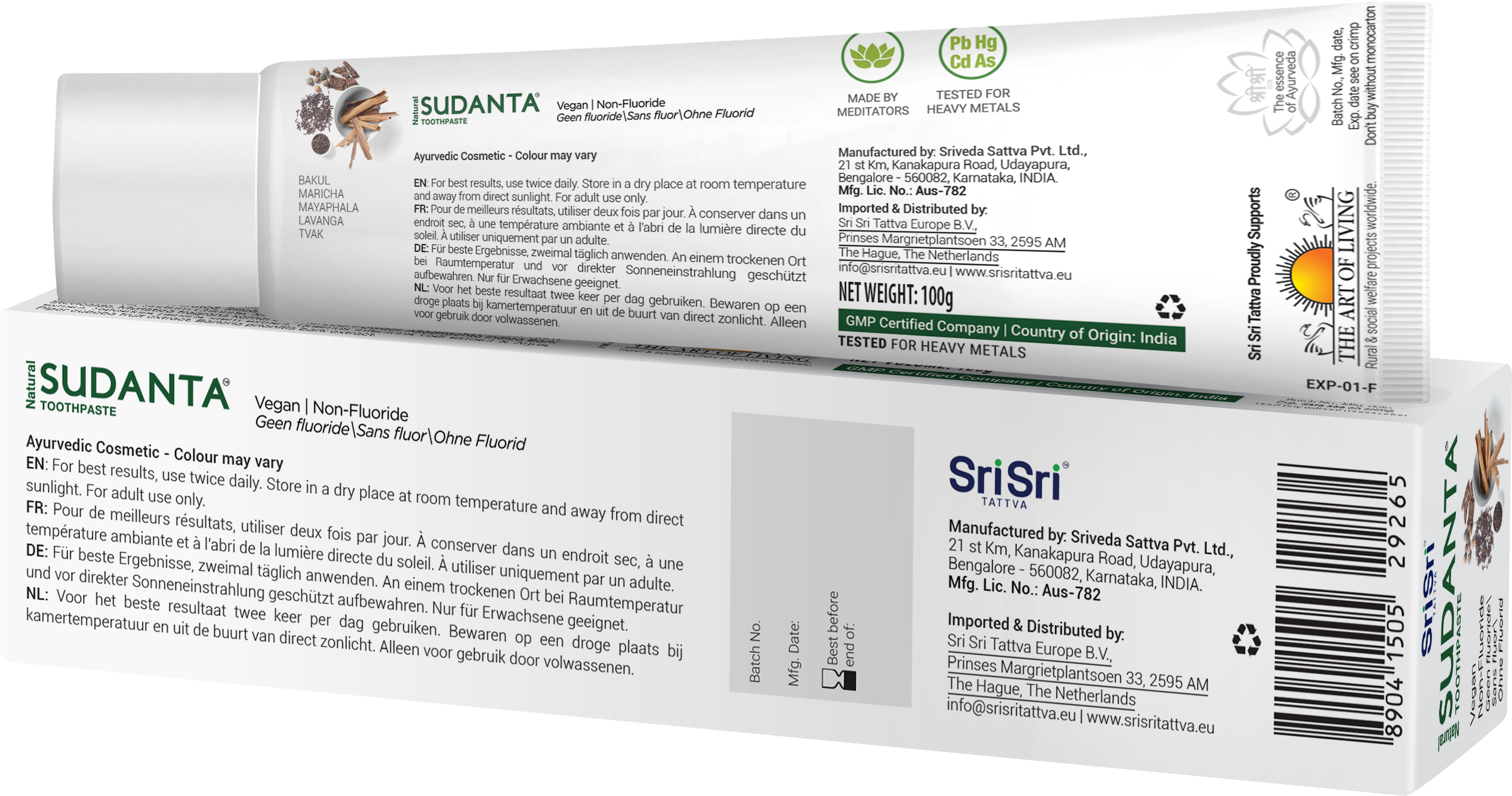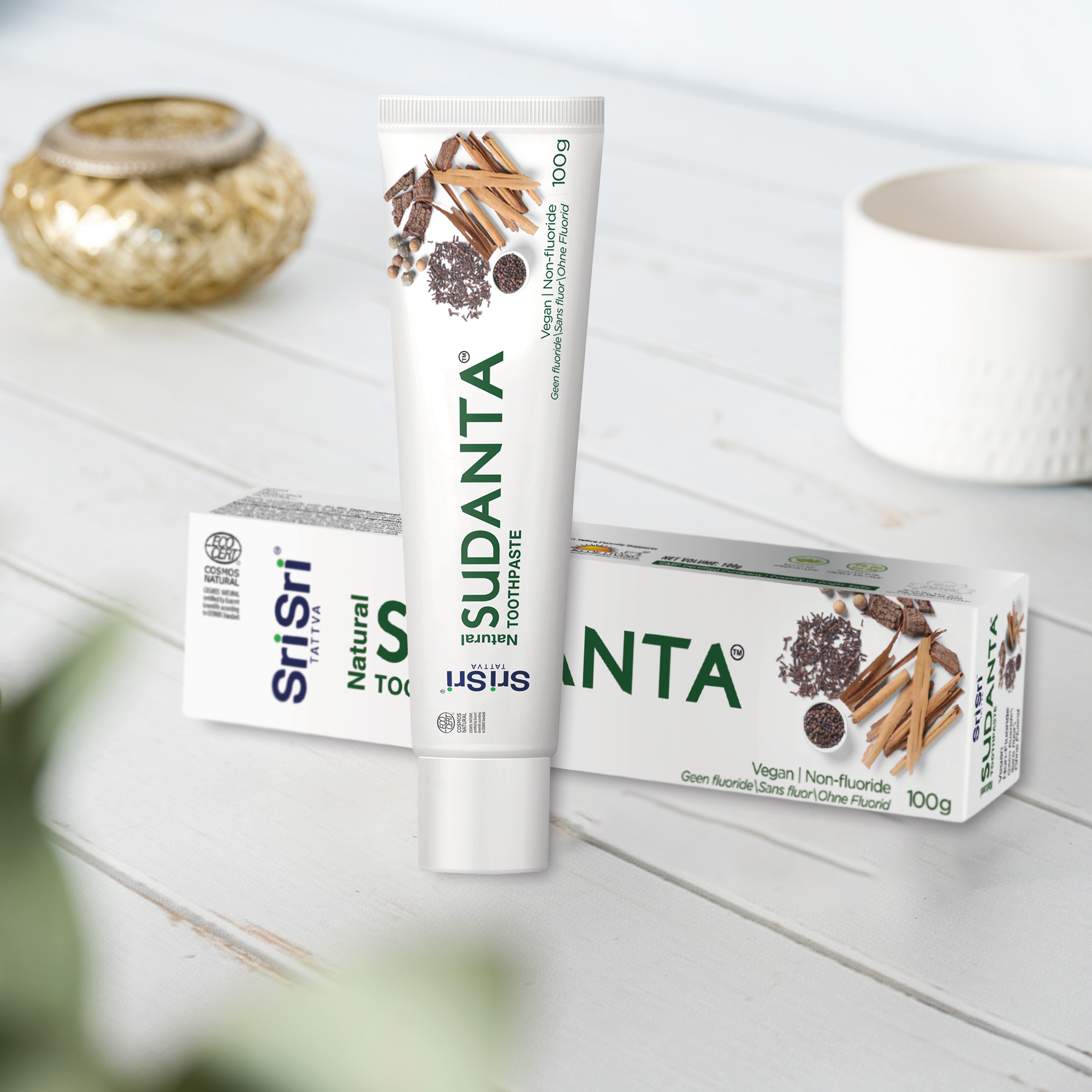 100% Natural, Non-Fluoride, Saccharine-Free, Paraben-Free, Non-SLS, and Certified by Ecocert & COSMOS Natural — Sri Sri Tattva’s Sudanta Toothpaste delivers powerful Ayurvedic oral care with every brush.